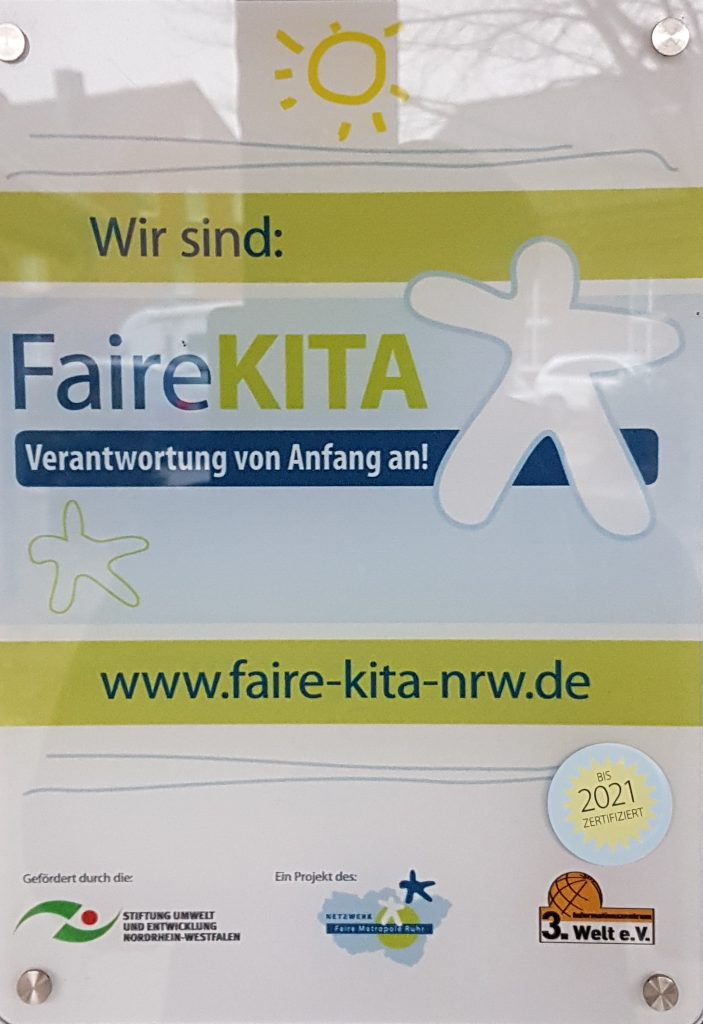 Eine FaireKITA zeichnet sich durch die Verwendung fairer Produkte und einen verantwortungsvollen Umgang mit Ressourcen aus. Außerdem lernen die Kinder in regelmäßigen Projektwochen spielerisch die Bedeutung von Fairtrade und Nachhaltigkeit kennen.