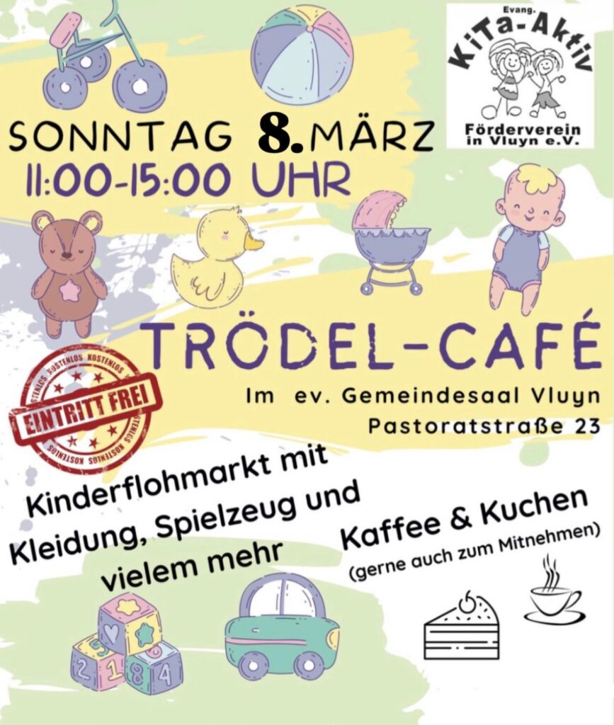 Zweimal im Jahr veranstalten wir im Gemeindesaal der evangelischen Kirchengemeinde in Vluyn (Pastoratstraße 23) ein Trödel-Café mit einem Kindertrödelmarkt. Getrödelt wird von Spielzeug bis Bekleidung alles rund ums Kind.